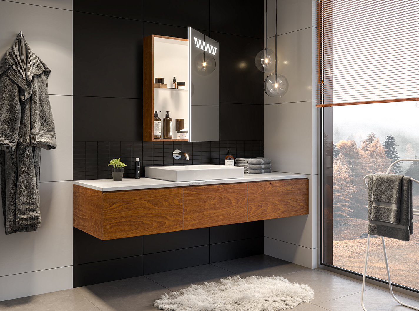 Specchio da bagno con mobiletto per il tuo bagnoSe stai cercando un mobile da bagno a specchio su misura, la collezione RUKE è la soluzione perfetta per te. Puoi ordinare uno specchio con mobiletto perfetto per la disposizione del tuo bagno. Offriamo modelli in vari colori di alloggiamento e vari sistemi di illuminazione. Realizziamo anche uno specchio da bagno con mobiletto su misura. Scegli una soluzione conveniente grazie alla quale organizzerai lo spazio del bagno e realizzerai un trucco perfetto.